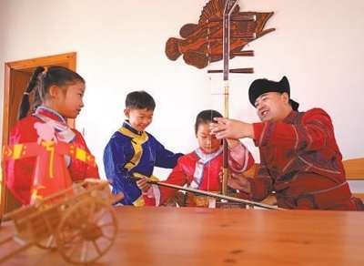 哈拉新村村民在教當(dāng)?shù)睾⒆友葑鄠鹘y(tǒng)樂(lè)器。齊齊哈爾大學(xué)孟加拉國(guó)籍留學(xué)生 衣睿實(shí)攝“在哈拉新村,我看到四弦琴造型的村口大門(mén)、魚(yú)叉狀的路燈,還有整整齊齊的‘介字房’……這里獨(dú)特的民族文化、濃郁的鄉(xiāng)土風(fēng)情,給我留下了深刻印象。當(dāng)?shù)丶缺A魝鹘y(tǒng)的達(dá)斡爾族人文特征,又開(kāi)發(fā)文化體驗(yàn)館、民族特色美食等現(xiàn)代旅游資源,重視文化保護(hù)和傳承的做法值得借鑒。”