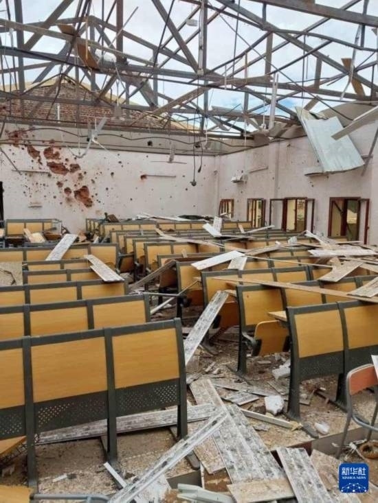 這是8月26日在蘇丹北達爾富爾州首府法希爾市拍攝的在炮擊中損毀的學校(手機照片)。新華社發(fā)(蘇丹北達爾富爾州衛(wèi)生部供圖)