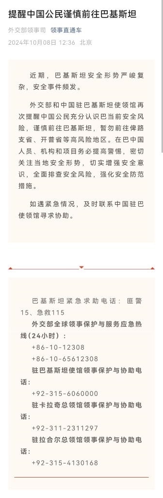 據(jù)外交部“領(lǐng)事直通車”微信公眾號10月8日消息,近期,巴基斯坦安全形勢嚴峻復(fù)雜,安全事件頻發(fā)。