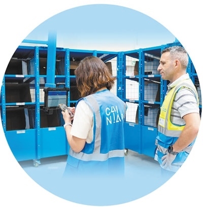 在菜鳥西班牙海外倉,兩名工作人員正在使用菜鳥自主研發(fā)的智能分揀柜系統(tǒng)進(jìn)行包裹分揀。 本報(bào)西班牙分社 大衛(wèi)·阿瑪爾攝