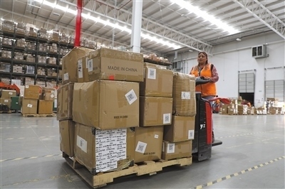美獅集團(tuán)墨西哥州海外倉內(nèi),一名員工從傳送帶取下貨物放到拖車上,準(zhǔn)備移動(dòng)至智能上架區(qū)入庫。本報(bào)墨西哥分社 埃內(nèi)斯托·多明戈斯攝