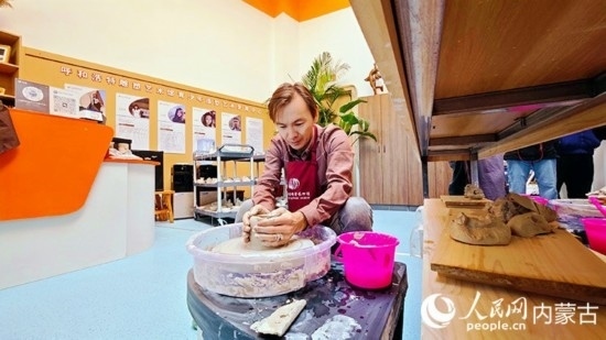 輪盤帶著陶泥緩緩旋轉(zhuǎn),隨著指尖的輕觸,陶泥逐漸被拉高,一塊塊不起眼的泥巴變化出各樣的形態(tài)。10月22日,“一帶一路”青年友好交流項(xiàng)目“外媒看青城”媒體采風(fēng)團(tuán)在呼和浩特雕塑藝術(shù)館的美育中心進(jìn)行泥塑和釉下彩體驗(yàn),一起“玩泥巴”!