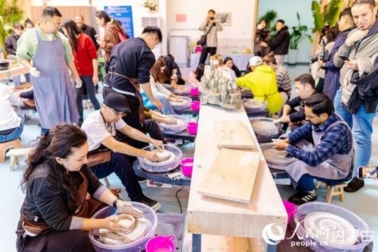 外媒記者進(jìn)行泥塑體驗(yàn)。人民網(wǎng)記者 張雪冬攝
