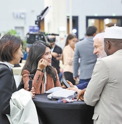 金磚喀山峰會(huì)新聞中心內(nèi),參會(huì)記者正在溝通交流。本報(bào)記者 韓曉明攝