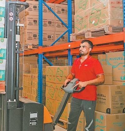 工作人員在位于阿聯(lián)酋迪拜的極兔速遞海外倉(cāng)內(nèi)搬運(yùn)貨物。本報(bào)記者 任皓宇攝