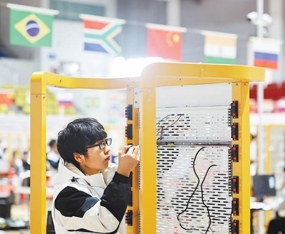 在江蘇省南通市,參賽選手在2023年金磚國(guó)家職業(yè)技能大賽中國(guó)分賽區(qū)物聯(lián)網(wǎng)賽項(xiàng)國(guó)際總決賽中比拼。徐培欽攝(人民視覺(jué))