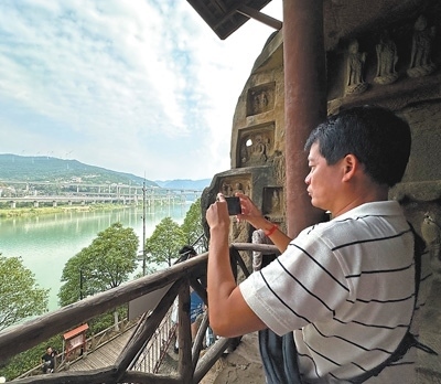 老撾《萬象時(shí)報(bào)》記者索薩坤·萬喬在參觀廣元千佛崖時(shí),拍攝飛馳而過的動(dòng)車組列車。老撾國家通訊社記者 汶娜萊·楠坎娜攝