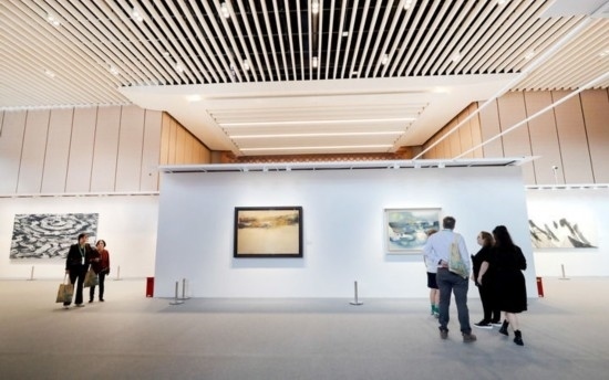 11月9日,觀眾在第七屆進博會國際現(xiàn)當代藝術(shù)專區(qū)觀看繪畫藝術(shù)展品。新華社記者 方喆 攝