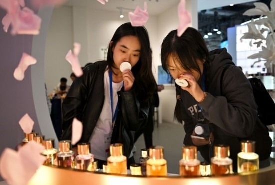 11月9日,觀眾在第七屆進博會歐萊雅展臺試聞香水。新華社發(fā)(陳浩明 攝)