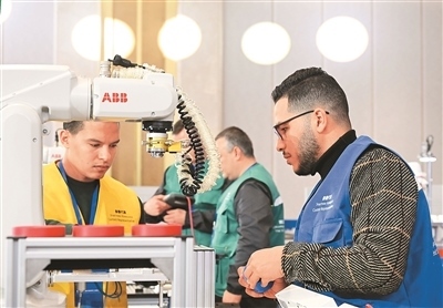 2024年12月18日,第三屆上合組織國家職工技能大賽在青島市開幕。圖為來自埃及的易卜拉欣·穆西·赫爾米·穆西(前右)與穆斯塔法·霍斯尼·穆斯塔法·梅特瓦利(前左)在工業(yè)機器人操作調(diào)整工項目比賽中。