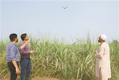 中國(guó)—巴基斯坦人工智能智慧農(nóng)業(yè)實(shí)驗(yàn)室研發(fā)人員運(yùn)用無(wú)人機(jī)定期巡檢畫(huà)面,通過(guò)人工智能分析,實(shí)時(shí)向農(nóng)戶反饋?zhàn)魑锷L(zhǎng)情況。