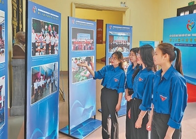 4月14日,越南青年參觀在河內舉行的中越青年交流合作圖片展。?