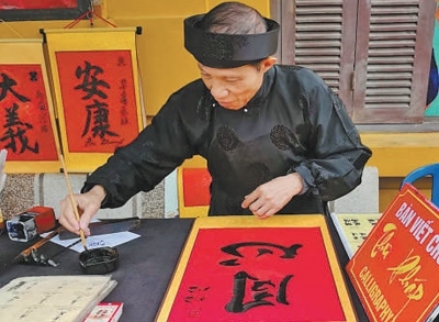 4月13日,在越南河內胡志明故居,當?shù)貢覟橹袊慰蜁鴮憽巴摹薄?/p>