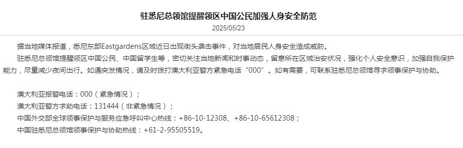 新華社悉尼5月23日電 中國(guó)駐悉尼總領(lǐng)館23日連續(xù)發(fā)布兩條提醒,提醒領(lǐng)區(qū)中國(guó)公民加強(qiáng)人身安全防范。