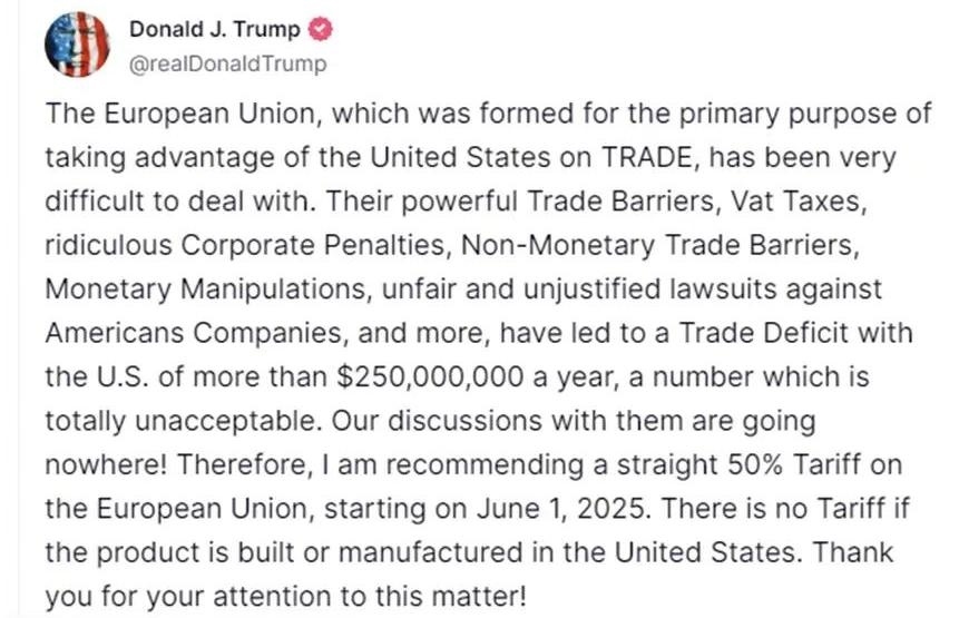 他說,美歐之間的磋商停滯不前?!耙虼耍医ㄗh自2025年6月1日起,對歐盟商品統(tǒng)一征收50%關(guān)稅。若產(chǎn)品在美國本土生產(chǎn)制造,則免征關(guān)稅。”
