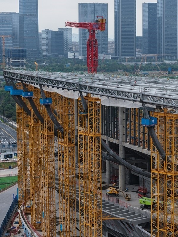 目前,體育館及游泳跳水館工程主體結(jié)構(gòu)全面封頂,已進入大規(guī)模鋼結(jié)構(gòu)施工階段;足球場工程鋼屋蓋整體進度過半,主體結(jié)構(gòu)已完成90%,項目建設(shè)正穩(wěn)步推進。