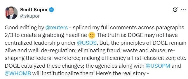 庫珀表示,“政府效率部”或許不再會(huì)有“集中化的領(lǐng)導(dǎo)”,但其工作準(zhǔn)則將繼續(xù)保留:減少章程架構(gòu);減少欺詐、浪費(fèi)和濫用;重塑聯(lián)邦人力結(jié)構(gòu);將效率放在首位等等?!罢什俊贝邉?dòng)了相關(guān)變革,美國(guó)人事管理局、白宮管理和預(yù)算辦公室一起將其制度化,“這才是真相”。