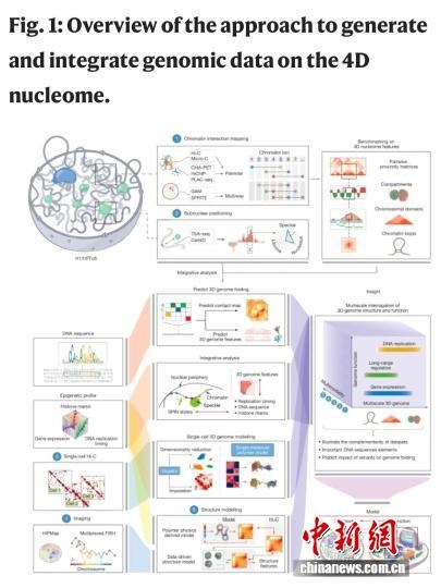 該論文介紹,人類(lèi)染色體的三維組織結(jié)構(gòu),對(duì)于協(xié)調(diào)遺傳物質(zhì)調(diào)控生物反應(yīng)過(guò)程起到重要作用。DNA纏繞組蛋白形成名為染色質(zhì)的復(fù)合體,存儲(chǔ)在細(xì)胞核內(nèi)。大量染色質(zhì)位點(diǎn)可通過(guò)生物化學(xué)修飾來(lái)調(diào)控基因表達(dá)。繪制這一三維結(jié)構(gòu)及其如何經(jīng)時(shí)(第四維度)改變的工作,被稱(chēng)為4D核組學(xué)。