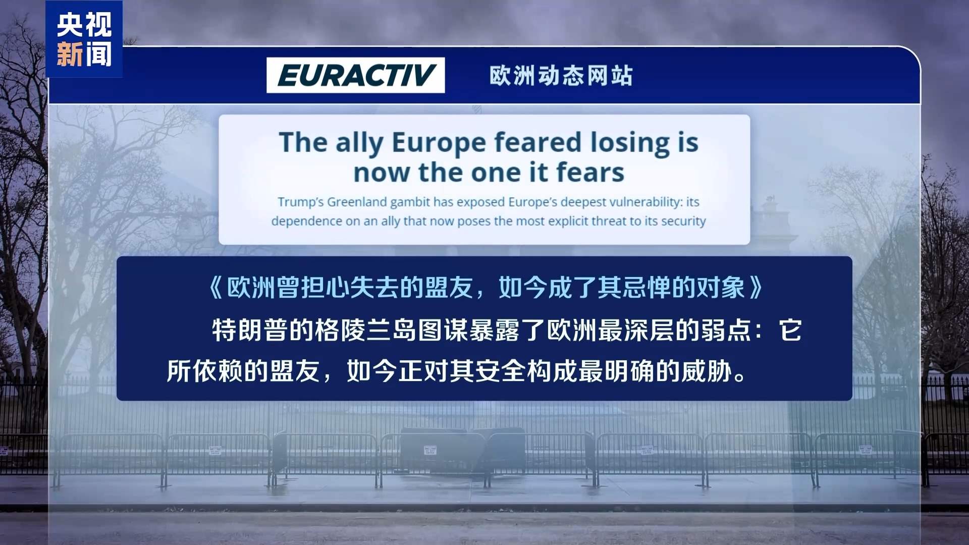歐洲動(dòng)態(tài)網(wǎng)站6日以《歐洲曾擔(dān)心失去的盟友,如今成了其忌憚的對(duì)象》為題評(píng)論說(shuō),“特朗普的格陵蘭島圖謀暴露了歐洲最深層的弱點(diǎn):它所依賴的盟友,如今正對(duì)其安全構(gòu)成最明確的威脅?!蔽恼逻€提醒說(shuō),我們正進(jìn)入一個(gè)“強(qiáng)權(quán)即公理”的新世界——而歐洲人對(duì)此毫無(wú)準(zhǔn)備?;蛟S,格陵蘭島可能帶來(lái)的羞辱,將促使歐洲人反思這一現(xiàn)狀,并最終采取行動(dòng)改變局面。