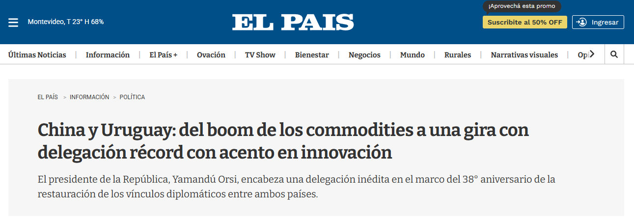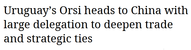南美新聞機(jī)構(gòu)Merco Press報(bào)道稱,此次訪問(wèn)正值烏拉圭與中國(guó)建交38周年,烏拉圭總統(tǒng)奧爾西率領(lǐng)約150人的代表團(tuán)啟程訪華,旨在“加強(qiáng)與烏拉圭最大貿(mào)易伙伴之間的經(jīng)濟(jì)聯(lián)系”。