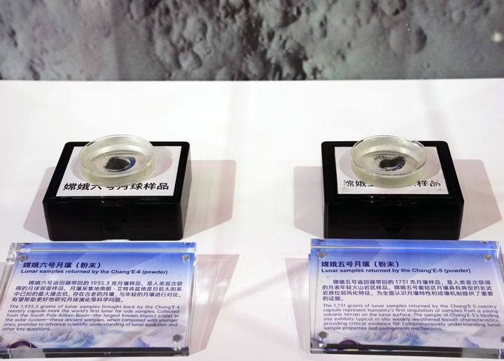 2025年11月5日在第八屆進(jìn)博會國家展中國館拍攝的“嫦娥五號”月壤和“嫦娥六號”月壤。新華社記者 劉穎 攝