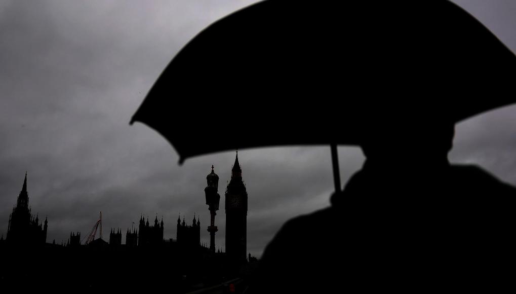 1月27日,一名男子撐傘走在英國(guó)倫敦大本鐘附近。新華社記者李穎攝