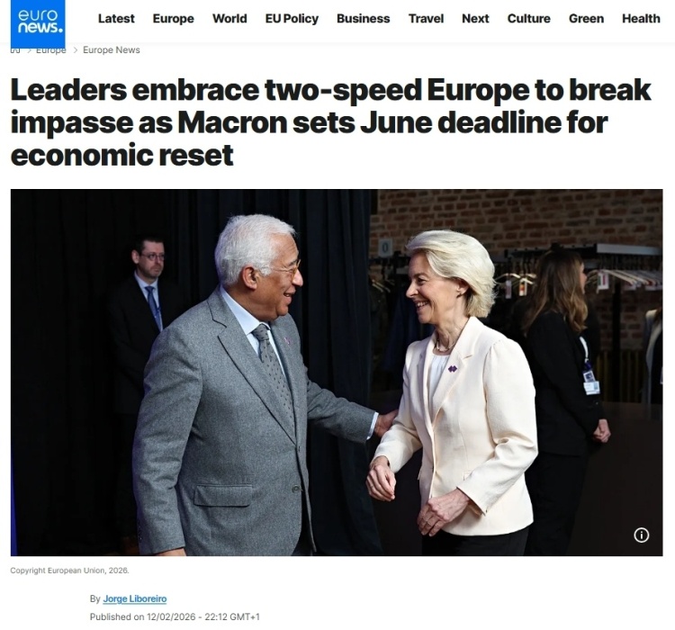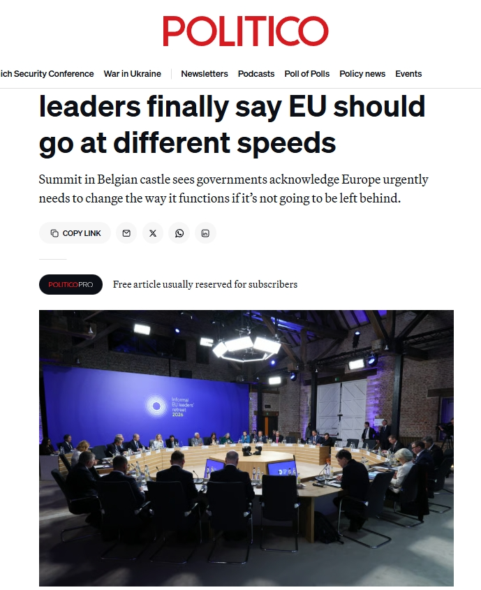 《政治報(bào)》網(wǎng)站歐洲版的報(bào)道評論稱,歐盟一直以其成員國團(tuán)結(jié)一致向前邁進(jìn)而自豪,那個時代已經(jīng)結(jié)束了。2月12日在比利時舉行的會議上,法國、德國、意大利等多國領(lǐng)導(dǎo)人支持,最早將于下個月的歐洲理事會上形成一項(xiàng)計(jì)劃,以簽署組成更小團(tuán)體的倡議。各國政府表示,由于歐洲的許多想法陷入優(yōu)柔寡斷和不和諧之中,歐洲的競爭優(yōu)勢正在逐漸消失,因此他們感到一種緊迫感。
