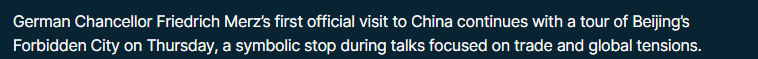 歐洲新聞電視臺(tái)26日?qǐng)?bào)道稱(chēng),在經(jīng)濟(jì)緊張局勢(shì)加劇的背景下,德國(guó)正努力尋求更平衡的貿(mào)易關(guān)系。默茨此次訪(fǎng)問(wèn)期間的一個(gè)具有象征意義的環(huán)節(jié)就是參觀故宮。報(bào)道稱(chēng),默茨表示,德國(guó)乃至歐洲希望與中國(guó)建立一種平衡且可靠的伙伴關(guān)系。