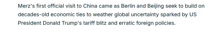 報(bào)道還強(qiáng)調(diào),默茨是繼英國(guó)首相斯塔默、法國(guó)總統(tǒng)馬克龍和加拿大總理卡尼之后,近幾個(gè)月來(lái)又一位訪(fǎng)問(wèn)中國(guó)的西方領(lǐng)導(dǎo)人,而這些訪(fǎng)問(wèn)正值美國(guó)政府對(duì)長(zhǎng)期貿(mào)易伙伴征收關(guān)稅引發(fā)連鎖反應(yīng)。