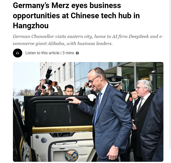半島電視臺(tái)網(wǎng)站26日發(fā)表題為《德國(guó)總理默茨正著眼于中國(guó)杭州這座科技之城的商機(jī)》。報(bào)道稱(chēng),默茨在其訪(fǎng)華行程的第二天前往中國(guó)科技重鎮(zhèn)杭州,隨行的有一個(gè)德國(guó)商界代表團(tuán),旨在與杭州的企業(yè)洽談合作事宜。