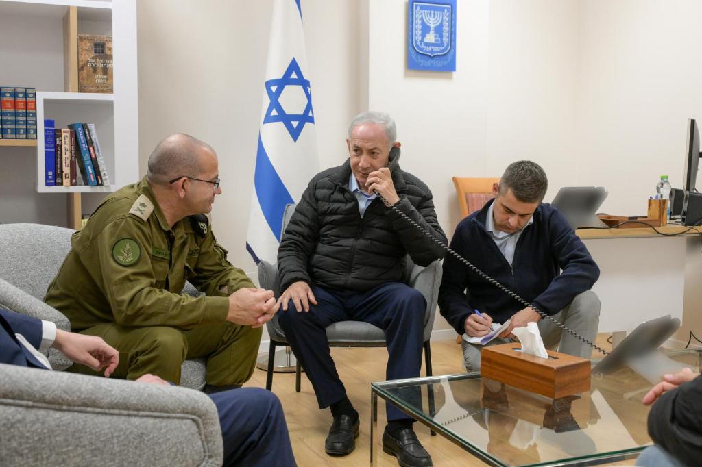 這是以色列總理辦公室3月17日在社交媒體上發(fā)布的以總理內(nèi)塔尼亞胡(中)與軍方人士一起打電話(huà)的圖片。新華社發(fā)