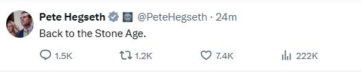 隨后,美國國防部長赫格塞思在社交媒體上發(fā)文,“回到石器時(shí)代”。