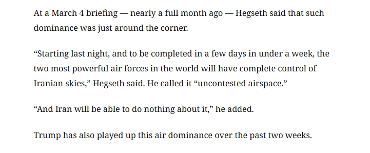 早在3月4日簡報會上,赫格塞思就曾宣稱,“從昨晚起,并在未來數(shù)日內(nèi)、總計不到一周的時間,全球最強大的兩支空軍將實現(xiàn)對伊朗領(lǐng)空的全面控制?!?他將這一局面描述為“無對抗領(lǐng)空”,并稱“伊朗對此將毫無辦法”。過去兩周,特朗普同樣在大力渲染這一空中優(yōu)勢。