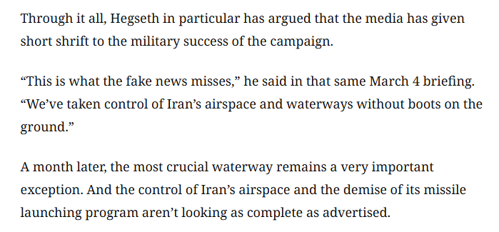 文章最后說,在赫格塞思說出這番話的一個月后,那條最關(guān)鍵的航道仍是一個“重大例外”。至于所謂“已完全掌控伊朗領(lǐng)空以及摧毀伊朗導彈發(fā)射能力”的說法,現(xiàn)實情況顯然與當初的宣揚大相徑庭。