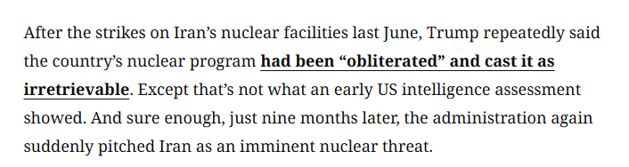 文章認為,去年6月美國轟炸伊朗核設施后,美國政府多次宣稱伊朗的核計劃已被“徹底摧毀”,“已無法挽回”。然而,美國當時的一份情報評估顯示事實并非如此。果然,僅僅九個月后,美國政府又突然將伊朗描繪成“迫在眉睫的核威脅”。