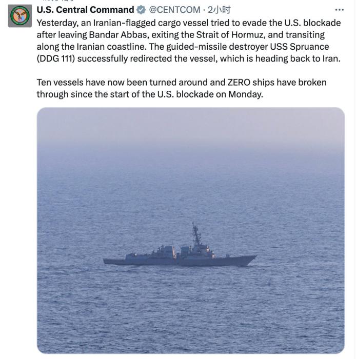 美軍中央司令部表示,自13日美軍開始實(shí)施封鎖以來,已有10艘船只被勒令返航,尚無船只突破封鎖。