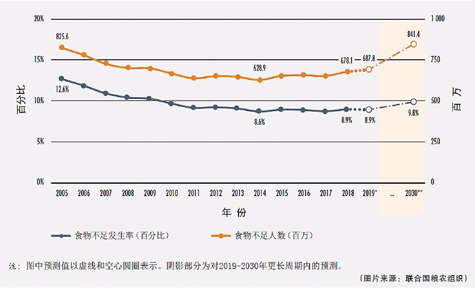 全球食物不足發(fā)生率及人數(shù)逐年統(tǒng)計(jì)和預(yù)測(cè)圖(圖片來(lái)源:聯(lián)合國(guó)糧農(nóng)組織)