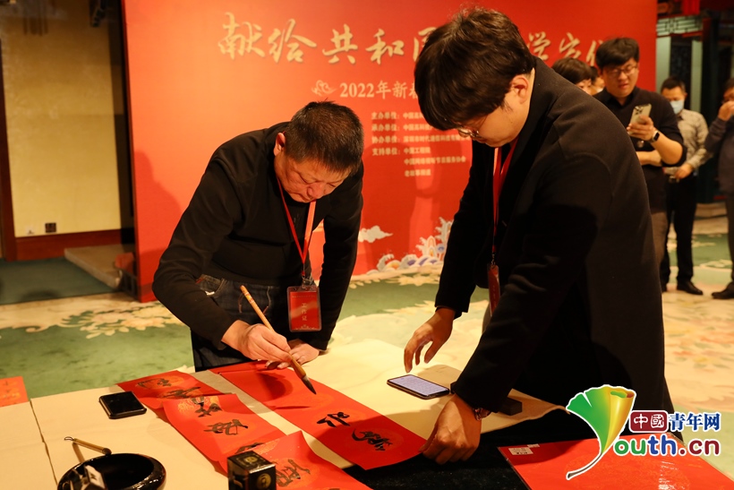 圖為書(shū)法家書(shū)寫"福"字和春聯(lián)。中國(guó)青年網(wǎng)記者 左橙 攝