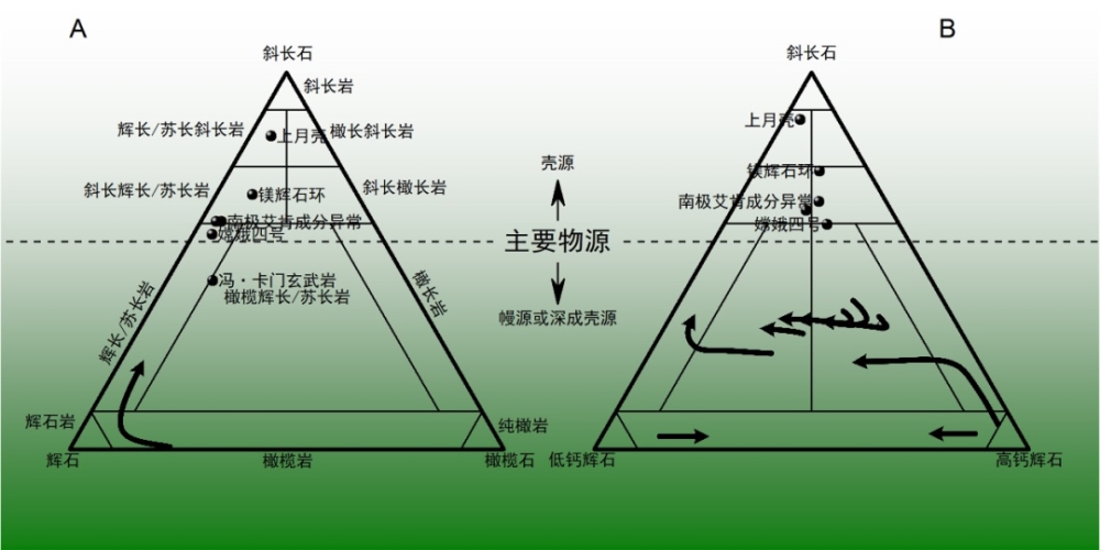 以往對南極-艾肯盆地物質(zhì)成分的研究大多只注重鎂鐵質(zhì)礦物,由于這一地區(qū)的鎂鐵質(zhì)異常特征,甚至引發(fā)了有關月幔是橄欖巖還是輝石巖的爭論。雖然根據(jù)月球巖漿洋假說,橄欖石和輝石是月幔的主要礦物,但是月殼形成之后的深成巖漿侵入作用同樣能夠在月殼中形成富集橄欖石或輝石的巖石,因此富集橄欖石或輝石并不能作為源自月幔的證據(jù)。迄今人類還沒有獲取南極-艾肯盆地的樣品返回地球,無法獲知其微量元素和同位素特征,通過遙感或原位探測可獲得的物質(zhì)成分信息中,斜長石含量也是區(qū)分殼源和幔源巖石的關鍵指標。