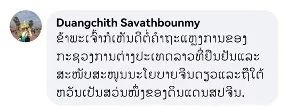 老撾黨中央機(jī)關(guān)報(bào)前總編輯、社長端吉·薩瓦本彌(Duangchith Savathbounmy)留言:“認(rèn)同我的祖國對臺灣問題的表態(tài),支持一個(gè)中國原則,臺灣是中國不可分割的一部分。”