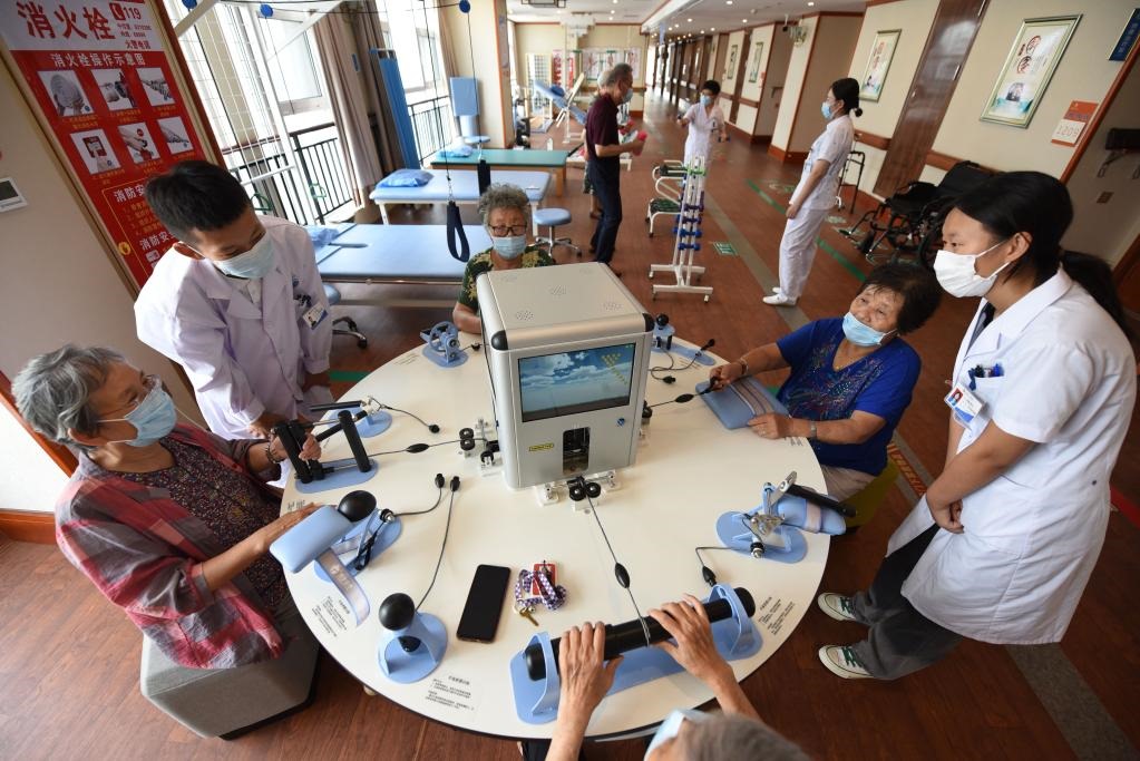 8月5日,在山東日照頤養(yǎng)公寓,醫(yī)生指導老人通過手功能綜合康復訓練平臺進行手指鍛煉。新華社記者范長國攝