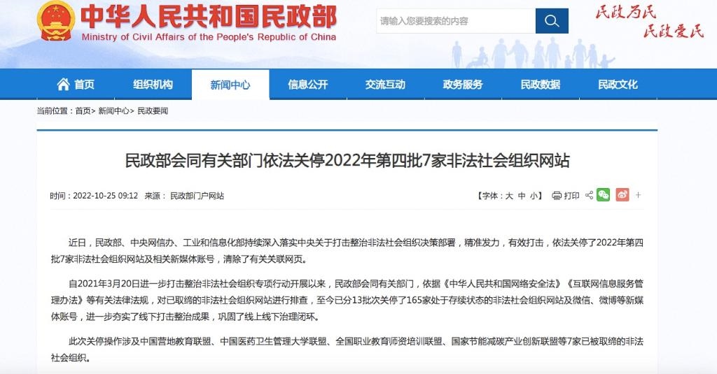 此次關(guān)停操作涉及中國營地教育聯(lián)盟、中國醫(yī)藥衛(wèi)生管理大學聯(lián)盟、全國職業(yè)教育師資培訓聯(lián)盟、國家節(jié)能減碳產(chǎn)業(yè)創(chuàng)新聯(lián)盟、中國監(jiān)督網(wǎng)浙江象山辦事處、中國煤礦創(chuàng)傷學會華北分會、全心犬意犬類領(lǐng)養(yǎng)中心等7家已被取締的非法社會組織。