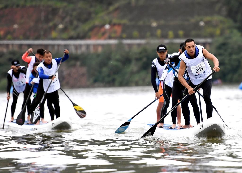 2018年11月18日,參賽選手在槳板團(tuán)體賽決賽中。當(dāng)日,2018年中國·將樂國際皮劃艇槳板馬拉松公開賽在福建省將樂縣落幕。新華社記者彭張青攝