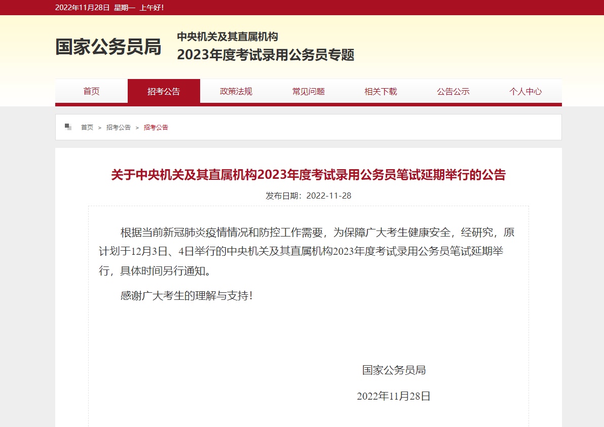 ??根據(jù)當前新冠肺炎疫情情況和防控工作需要,為保障廣大考生健康安全,經(jīng)研究,原計劃于12月3日、4日舉行的中央機關(guān)及其直屬機構(gòu)2023年度考試錄用公務(wù)員筆試延期舉行,具體時間另行通知。