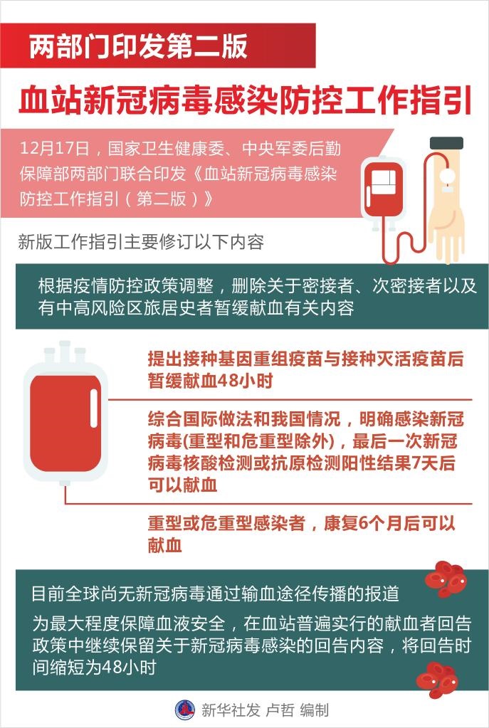 與2021年《血站新冠肺炎疫情常態(tài)化防控工作指引》相比,新版工作指引主要修訂以下內(nèi)容:根據(jù)疫情防控政策調(diào)整,新版工作指引刪除關(guān)于密接者、次密接者以及有中高風(fēng)險(xiǎn)區(qū)旅居史者暫緩獻(xiàn)血有關(guān)內(nèi)容。提出接種基因重組疫苗與接種滅活疫苗后暫緩獻(xiàn)血48小時(shí)。綜合國(guó)際做法和我國(guó)情況,明確感染新冠病毒(重型和危重型除外),最后一次新冠病毒核酸檢測(cè)或抗原檢測(cè)陽性結(jié)果7天后可以獻(xiàn)血;重型或危重型感染者,康復(fù)6個(gè)月后可以獻(xiàn)血。