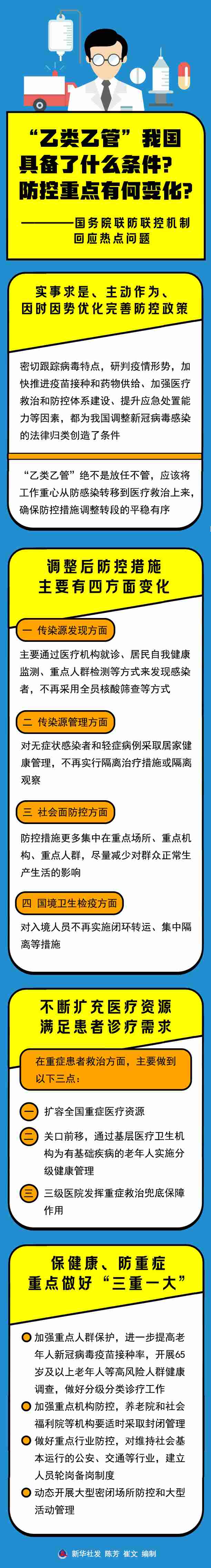 國家衛(wèi)生健康委疫情應(yīng)對處置工作領(lǐng)導小組專家組組長梁萬年說,“乙類乙管”絕不是放任不管,應(yīng)該將工作重心從防感染轉(zhuǎn)移到醫(yī)療救治上來,確保防控措施調(diào)整轉(zhuǎn)段的平穩(wěn)有序。