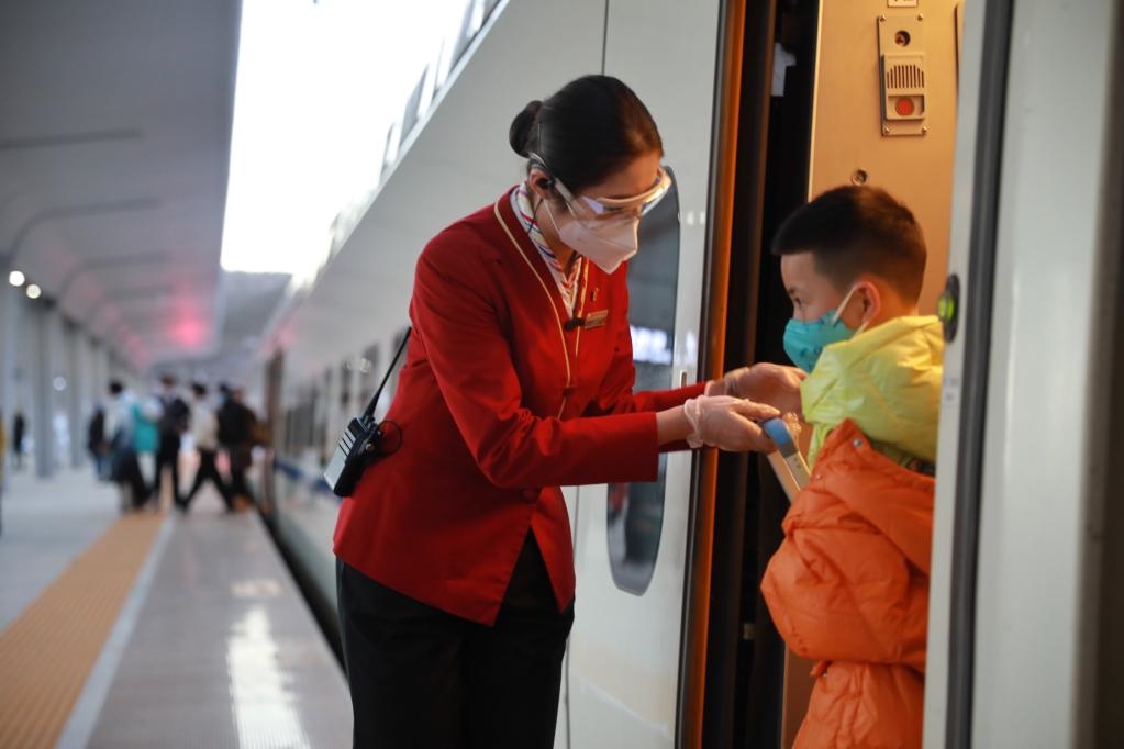 “本趟列車由清河站始發(fā),經(jīng)停八達(dá)嶺長(zhǎng)城站、下花園北站以及太子城站,最終到達(dá)崇禮站,全程1小時(shí)28分鐘?!贝汗?jié)前的最后一個(gè)周末,北京清河站人來(lái)人往,攜帶著各式各樣雪具的游客們正興沖沖地搭乘列車。作為北京連接崇禮的“冰雪線”,京張高鐵各趟列車每天準(zhǔn)點(diǎn)從北京北站或清河站出發(fā),載著游客們奔赴冰雪旅程。