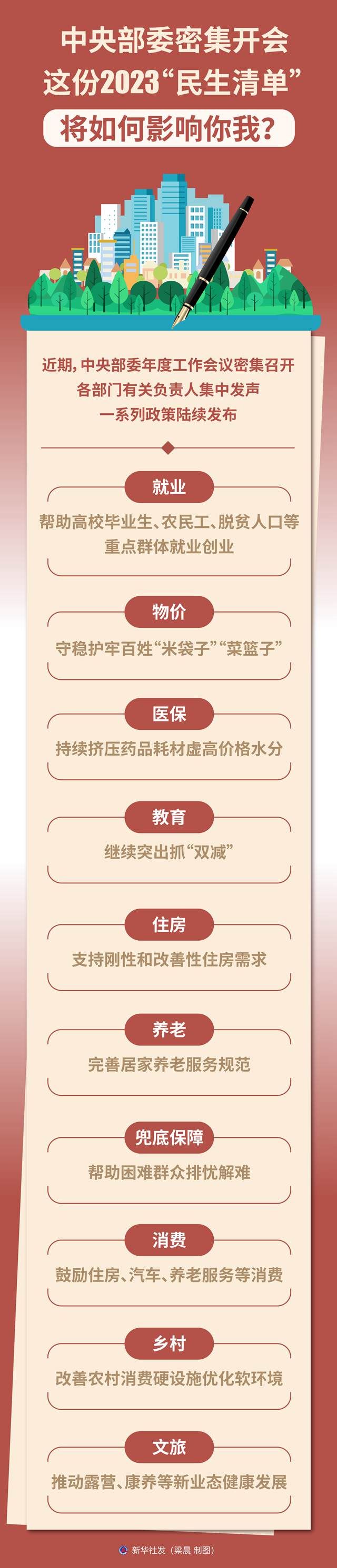 近期,中央部委年度工作會(huì)議密集召開(kāi),各部門(mén)有關(guān)負(fù)責(zé)人集中發(fā)聲,一系列政策陸續(xù)發(fā)布?!靶氯A視點(diǎn)”記者梳理了多個(gè)領(lǐng)域2023年聚焦民生關(guān)切的重要舉措。