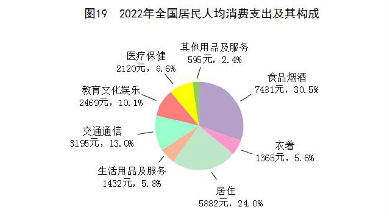 全年全國居民人均消費(fèi)支出24538元,比上年增長1.8%,扣除價(jià)格因素,實(shí)際下降0.2%。其中,人均服務(wù)性消費(fèi)支出[54]10590元,比上年下降0.5%,占居民人均消費(fèi)支出的比重為43.2%。按常住地分,城鎮(zhèn)居民人均消費(fèi)支出30391元,增長0.3%,扣除價(jià)格因素,實(shí)際下降1.7%;農(nóng)村居民人均消費(fèi)支出16632元,增長4.5%,扣除價(jià)格因素,實(shí)際增長2.5%。全國居民恩格爾系數(shù)為30.5%,其中城鎮(zhèn)為29.5%,農(nóng)村為33.0%。