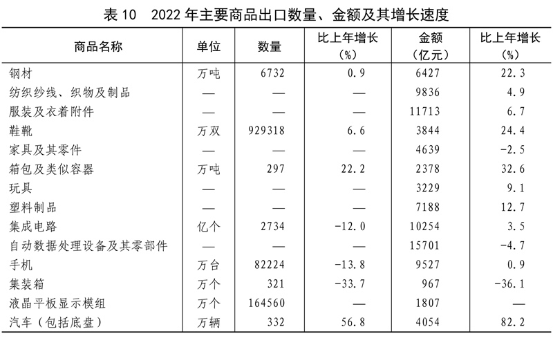 全年貨物進(jìn)出口總額420678億元,比上年增長7.7%。其中,出口239654億元,增長10.5%;進(jìn)口181024億元,增長4.3%。貨物進(jìn)出口順差58630億元,比上年增加15330億元。對“一帶一路”[40]沿線國家進(jìn)出口總額138339億元,比上年增長19.4%。其中,出口78877億元,增長20.0%;進(jìn)口59461億元,增長18.7%。對《區(qū)域全面經(jīng)濟(jì)伙伴關(guān)系協(xié)定》(RCEP)其他成員國[41]進(jìn)出口額129499億元,比上年增長7.5%。